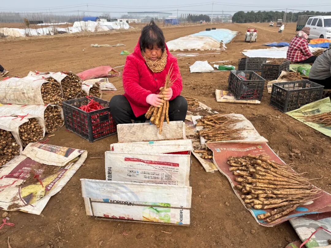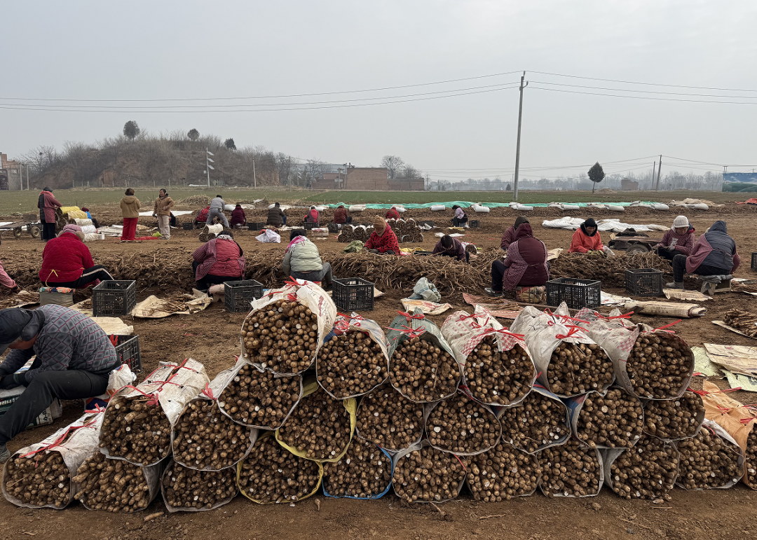 “今年天气干旱,山药收成受到了一定影响,每亩大约能收获17000至18000棵山药种子,虽略低于往年,但品质依旧上乘。”谢江峰介绍,白玉山药适应性强,且寇店的土壤条件十分适宜其生长,培育出的种子颗粒饱满、芽眼完好,深受成品山药种植户的青睐。采收现场,忙碌的不仅有专业种植人员,还有不少周边社区居民的身影。为保障采收进度,谢江峰每天雇佣约50名工人,采收高峰期人数可达100人,这些工人大多是具备丰富采收经验的专业人员;人手紧张时,附近居民便会主动前来务工,在专业人员的指导下参与辅助工作,每人每天可获得100元的稳定收入,真正实现“家门口就业、指尖上增收”。